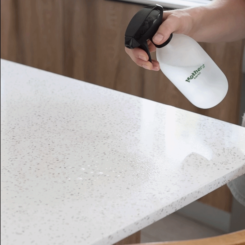 Spray directly onto the surface (e.g. table) or onto the Mother’s Earth cloth and wipe clean. Works on glass, wood, ceramic, stone and more.